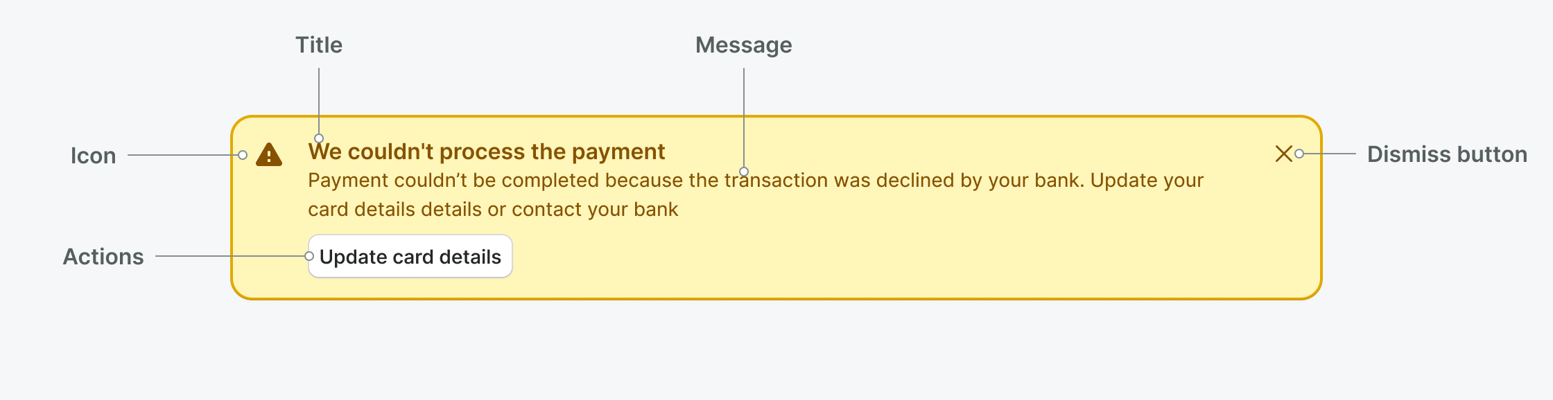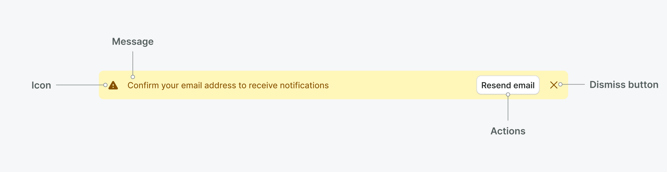 - Title: (optional) Summarizes the banner in a short, clear statement to grab the user’s attention. (Not available for compact variant)