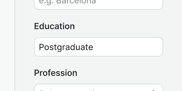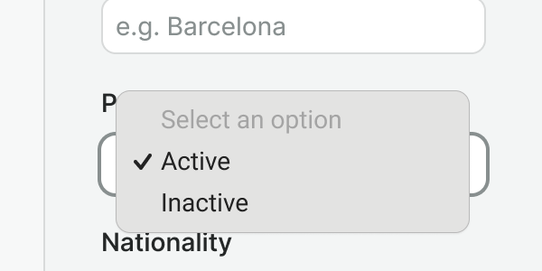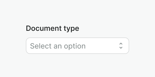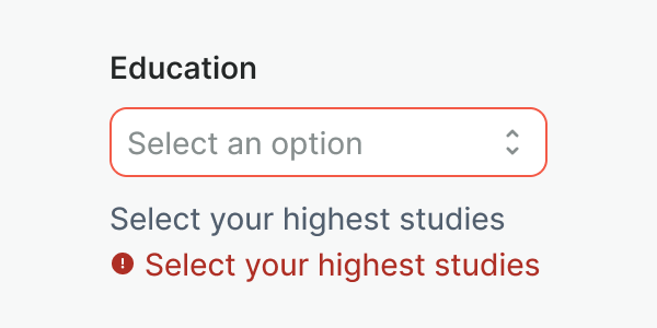 Use placeholders in select fields to let the user know the action that they need to perform (generally: "Select an option"). They can never be a substitute for the label or hint because they do not meet a strong contrast ratio.